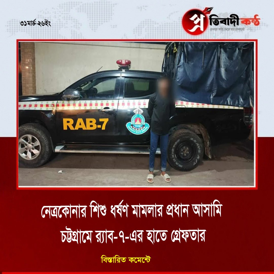 - নেত্রকোনার শিশু ধর্ষণ মামলার প্রধান আসামি চট্টগ্রামে র্যাব-৭-এর হাতে গ্রেফতার