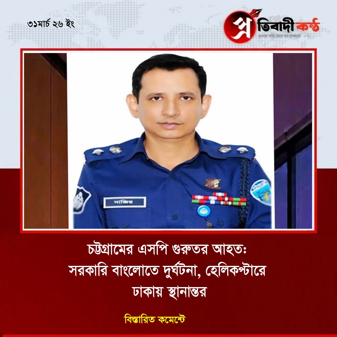 - চট্টগ্রামের এসপি গুরুতর আহত: সরকারি বাংলোতে দুর্ঘটনা, হেলিকপ্টারে ঢাকায় স্থানান্তর