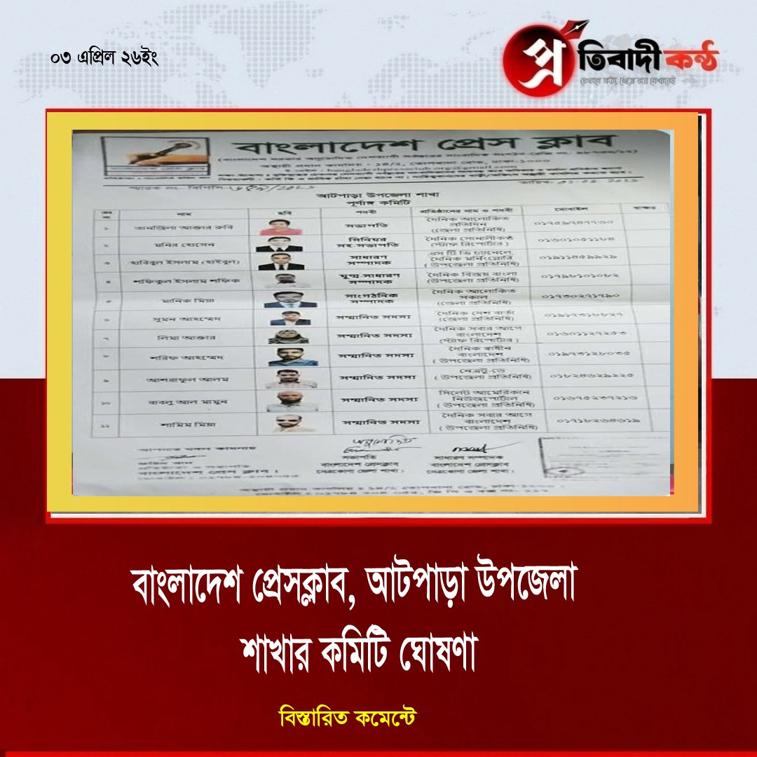 - বাংলাদেশ প্রেসক্লাব, আটপাড়া উপজেলা শাখার কমিটি ঘোষণা