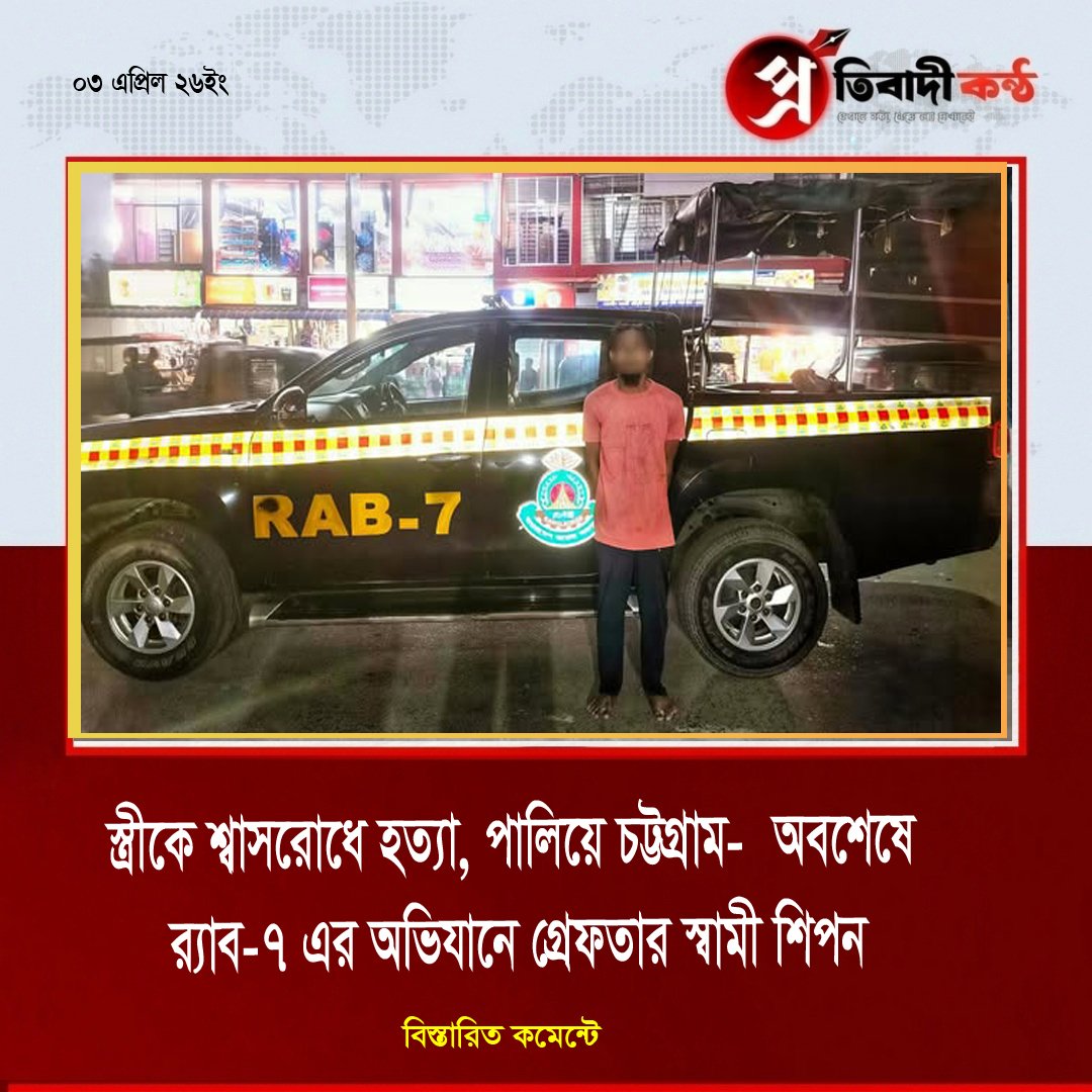 - স্ত্রীকে শ্বাসরোধে হত্যা, পালিয়ে চট্টগ্রাম—অবশেষে র্যাব-৭ এর অভিযানে গ্রেফতার স্বামী শিপন