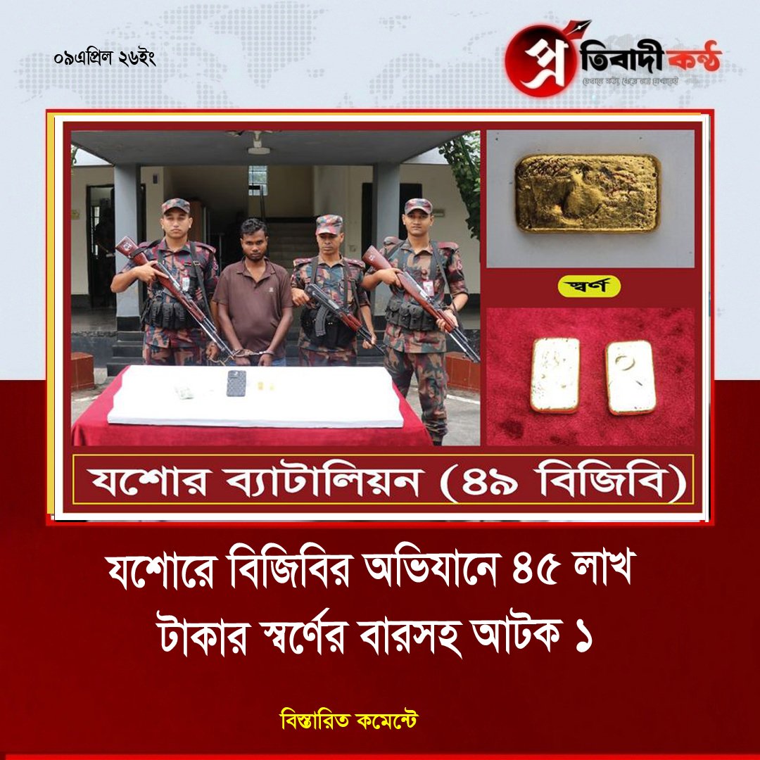- যশোরে বিজিবির অভিযানে ৪৫ লাখ টাকার স্বর্ণের বারসহ আটক ১