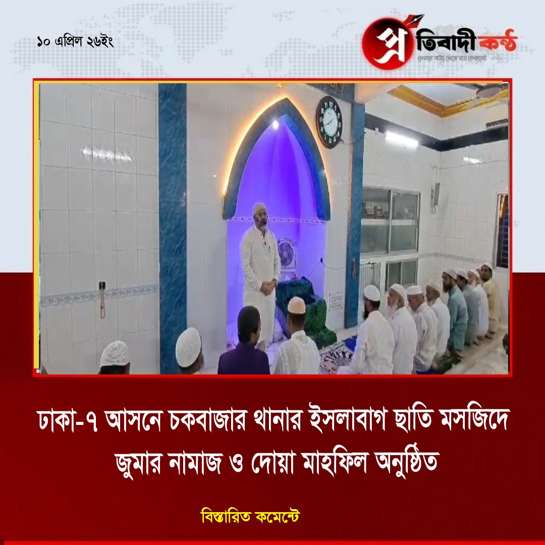 - ঢাকা-৭ আসনে চকবাজার থানার ইসলাবাগ ছাতি মসজিদে জুমার নামাজ ও দোয়া মাহফিল অনুষ্ঠিত