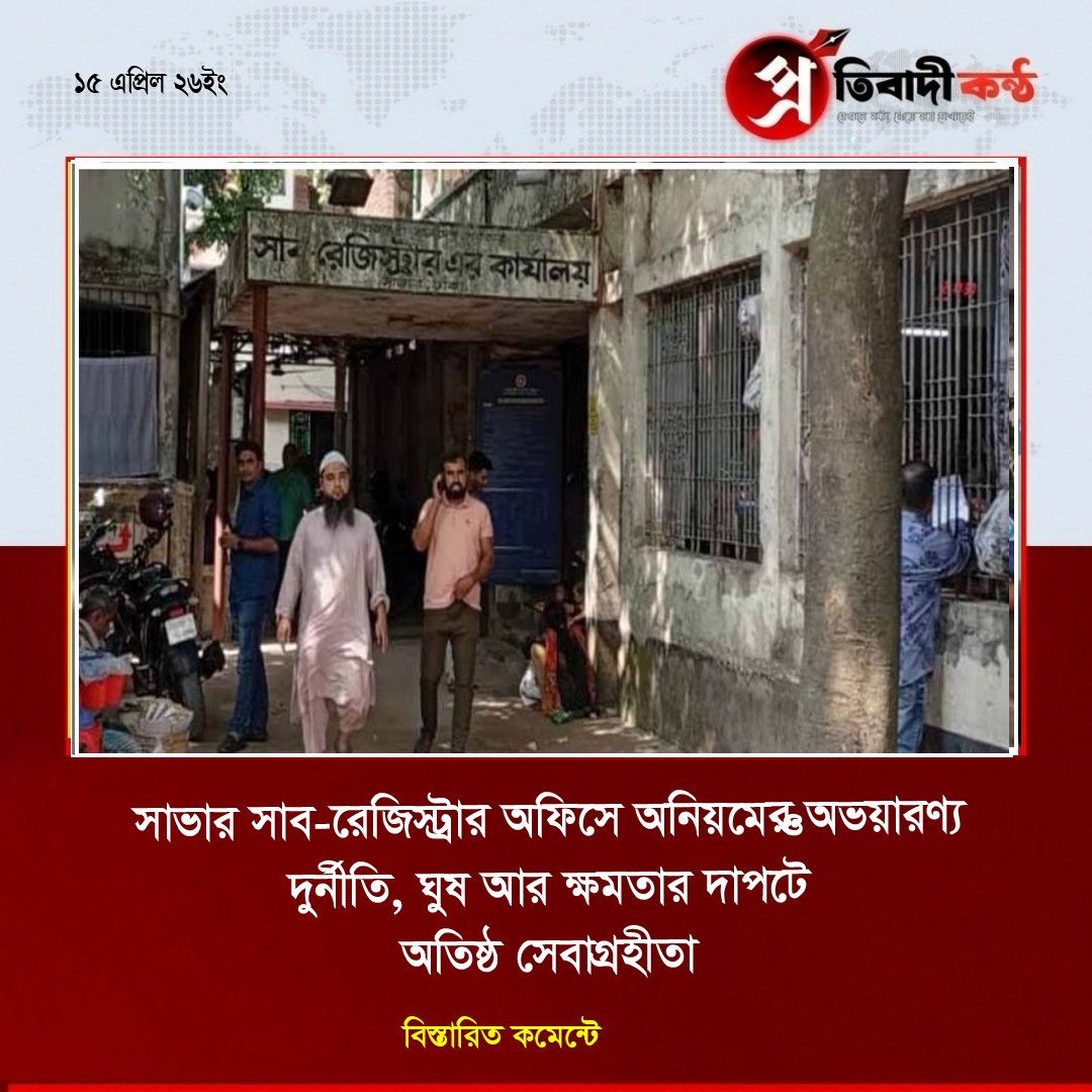 - সাভার সাব-রেজিস্ট্রার অফিসে অনিয়মের ‘অভয়ারণ্য’—দুর্নীতি, ঘুষ আর ক্ষমতার দাপটে অতিষ্ঠ সেবাগ্রহীতা