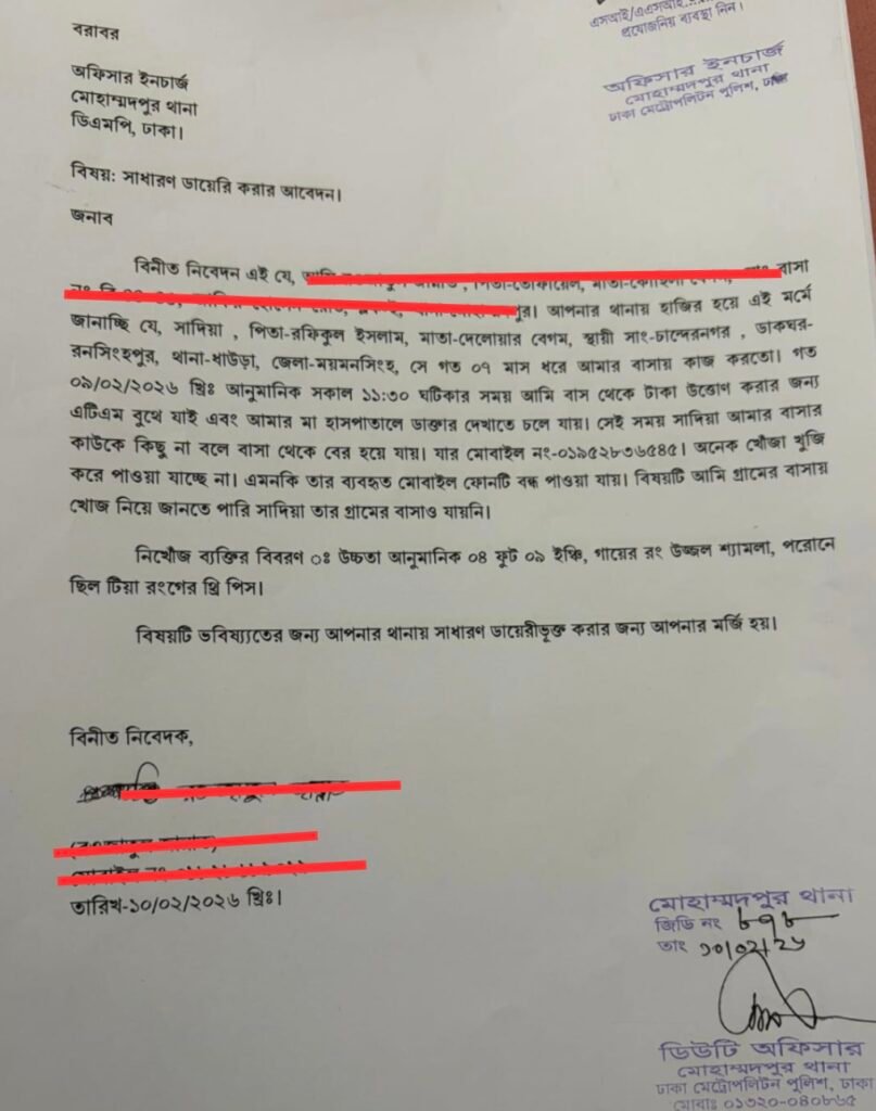 জিডি সূত্রে জানা গেছে, সাদিয়া গত প্রায় ৭ মাস ধরে মোহাম্মদপুরের জাকির হোসেন রোড এলাকার একটি বাসায় গৃহকর্মী হিসেবে কর্মরত ছিলেন। গত ০৯ ফেব্রুয়ারি ২০২৬ তারিখ সকাল আনুমানিক ১১টা ৩০ মিনিটের দিকে তিনি কাউকে কিছু না জানিয়ে বাসা থেকে বের হয়ে যান। এরপর থেকে তার আর কোনো খোঁজ পাওয়া যায়নি।