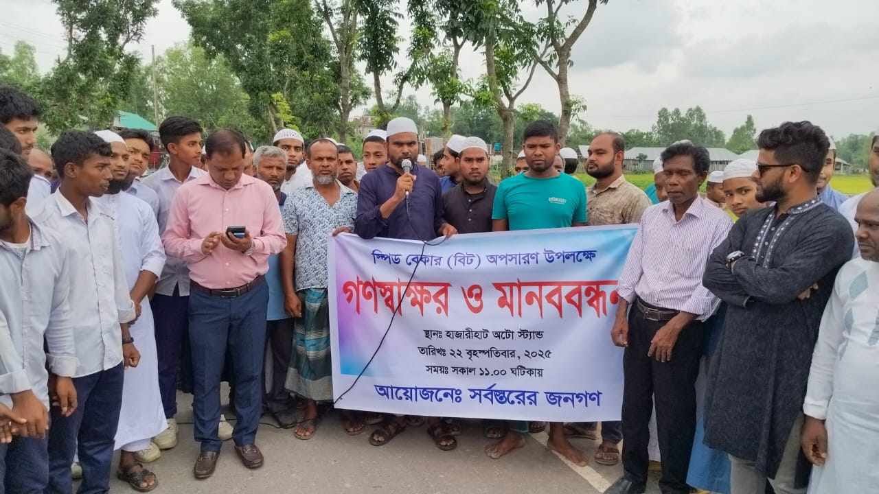 সৈয়দপুরে হাজারীহাটে অতিরিক্ত স্পিড ব্রেকার অপসারণের দাবিতে মানববন্ধন ও গণস্বাক্ষর।