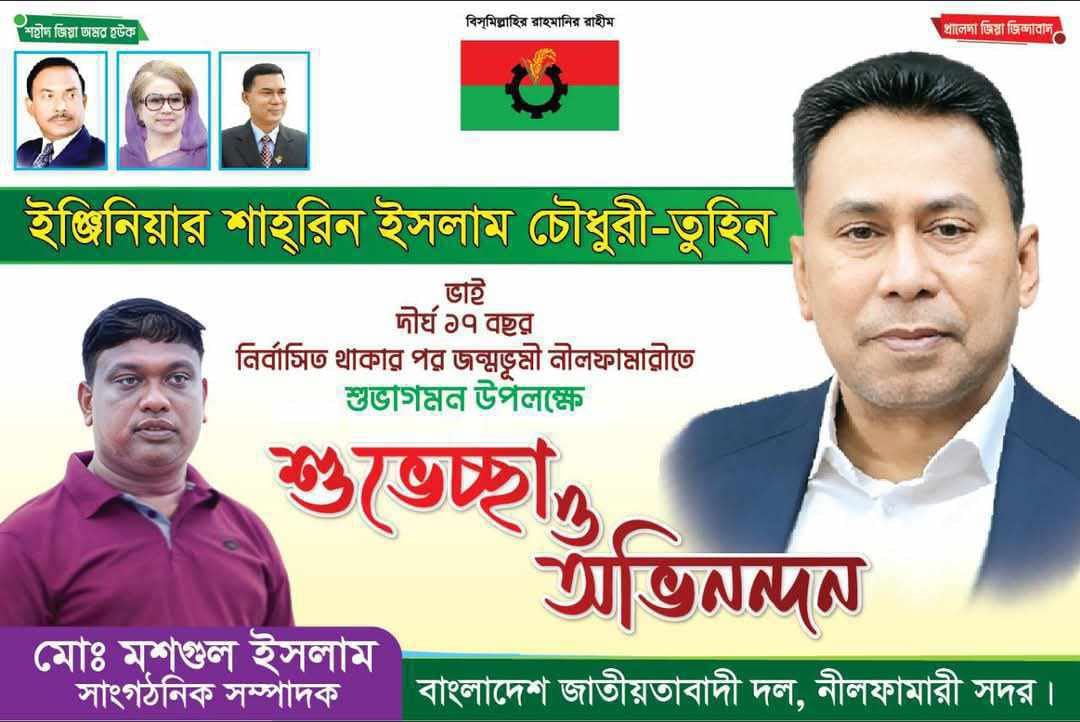 তারেক রহমানের খালাতো ভাই তুহিন নিজ গ্রামে আগমনে নীলফামারী জেলা বিএনপির ব্যাপক প্রস্তুতি